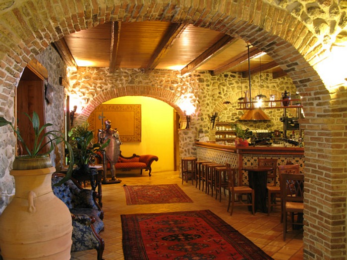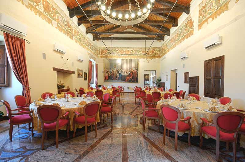 All'interno, la Struttura è suddivisa in diversi saloni abbelliti da affreschi dell'epoca a cui risale, la vecchia scuderia e l'antico teatro del castello, ora, restaurato per accogliere banchetti.