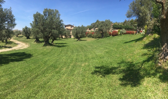 Un ampio giardino con area piscina, terrazza panoramica e tensostruttura.