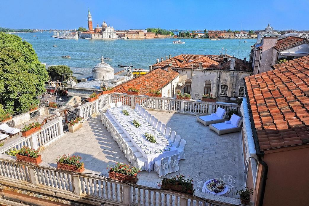 Due splendide terrazze con vista sul Bacino di San Marco e sull'isola di San Giorgio, dove festeggiare un ricevimento fino a 70 invitati. Un'ambiente perfetto anche per cocktail e cerimonie simboliche.