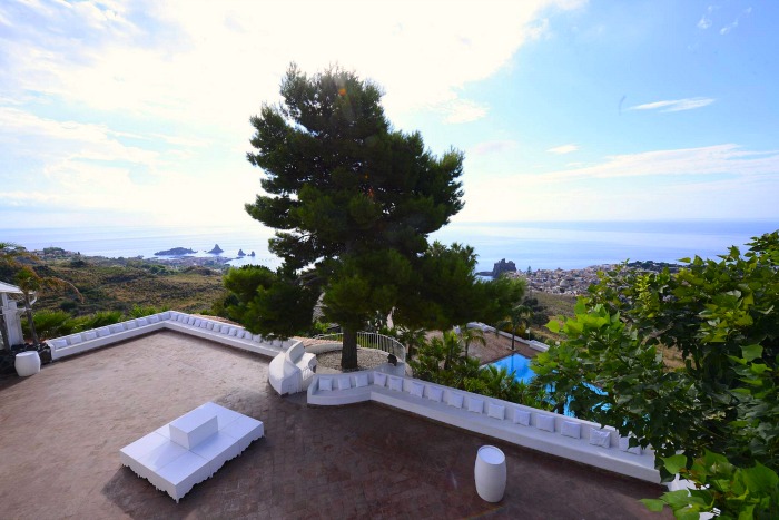 Giardino, terrazza e piscina con vista panoramica sul mare.