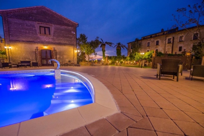 Adiacente alla sala ricevimenti troviamo da un lato una graziosa corte in pietra rappresentante l'ingresso principale dell'antico casale, dall'altro un giardino molto curato e ricco di fiori, alberi di agrumi e palme secolari, mentre, in fondo, è presente l'area piscina dove si affaccia la suite nuziale, appena realizzata in un'antica casa colonica indipendente.